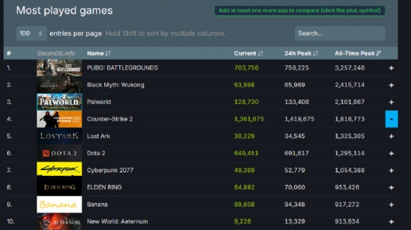 本作于2024年1月19日发售,同时在线游玩人数峰值突破210万人,也是Steam历史在线人数峰值榜第三名,仅次于《绝地求生》和《黑神话:悟空》。